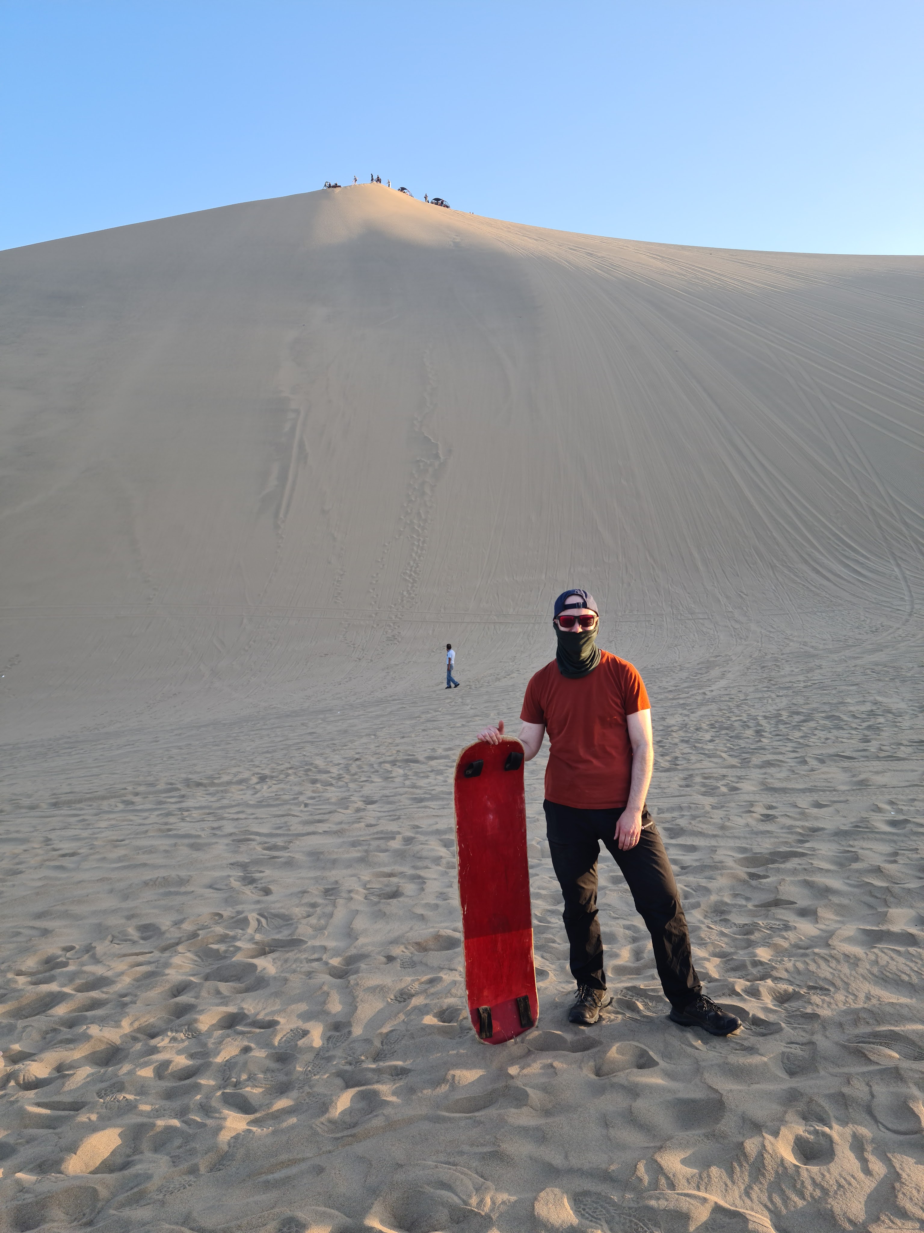 Gradually we were led to higher and higher dunes. The final one was a little deceptive, and actually didn’t look too bad from the top. The guides were absolutely insisting at this point we keep our feet down though. And for good reason. Once we got going, we realised the gradient was much steeper than what we’d experienced so far. The braking speed was more than enough. I’m not sure if it was the speed, or a change in terrain, but by the time we reached the bottom, it felt like our bones were shaking, the vibrations of the board were so strong.