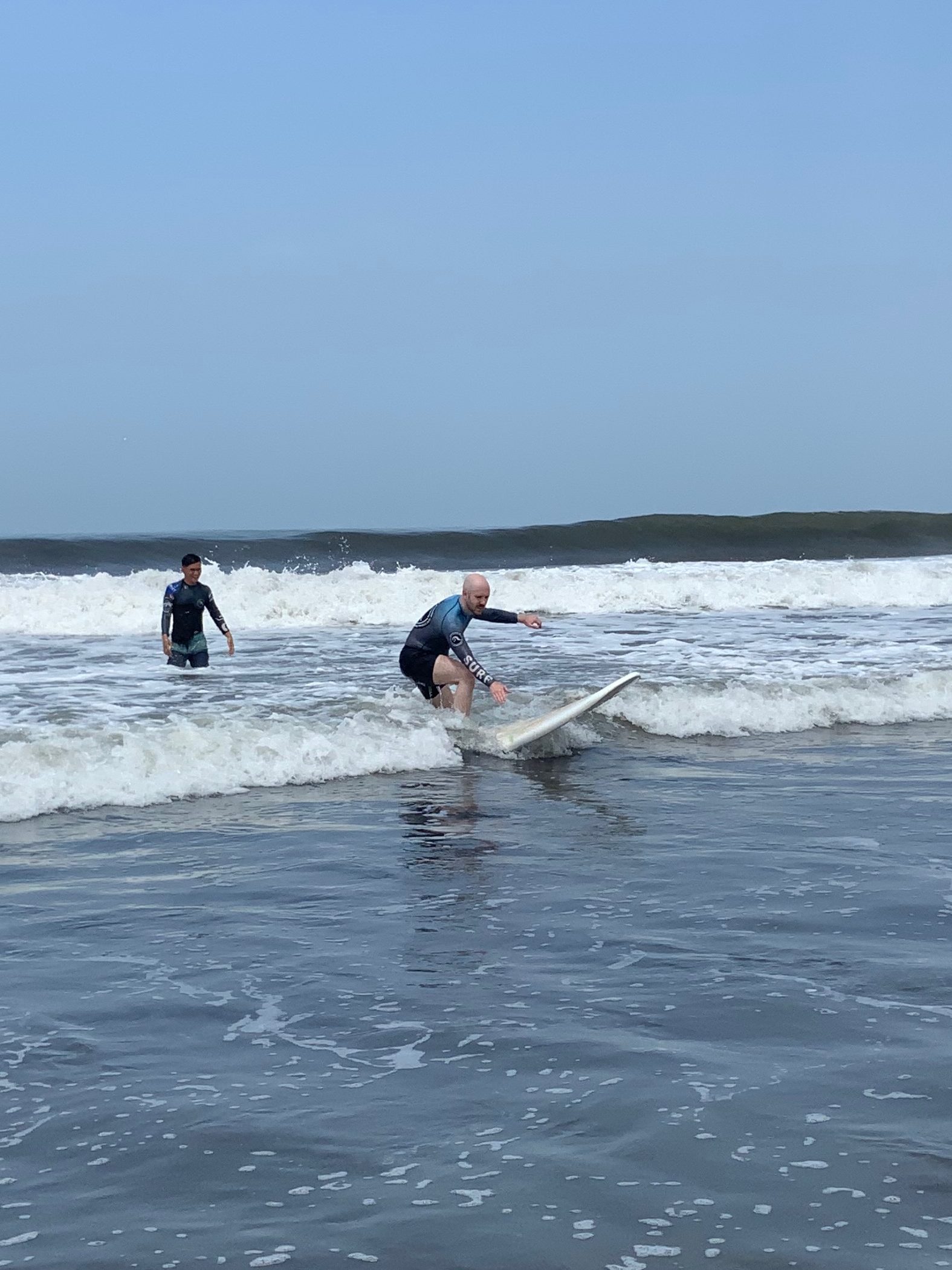 By the end of our lesson we were sufficiently wiped out, with some sand grazes on my legs. Just because I managed to reach the shore on some of my waves, does not mean I completed them elegantly… There was also a noticeable discomfort building around one of my toes. On my second to last wave, something bent in a way that I had definitely not been taught to. Adrenaline abating, now I was feeling the effects. By the time we got back to our apartment, I had a purple toe joint and a limp. Goofy footed indeed.