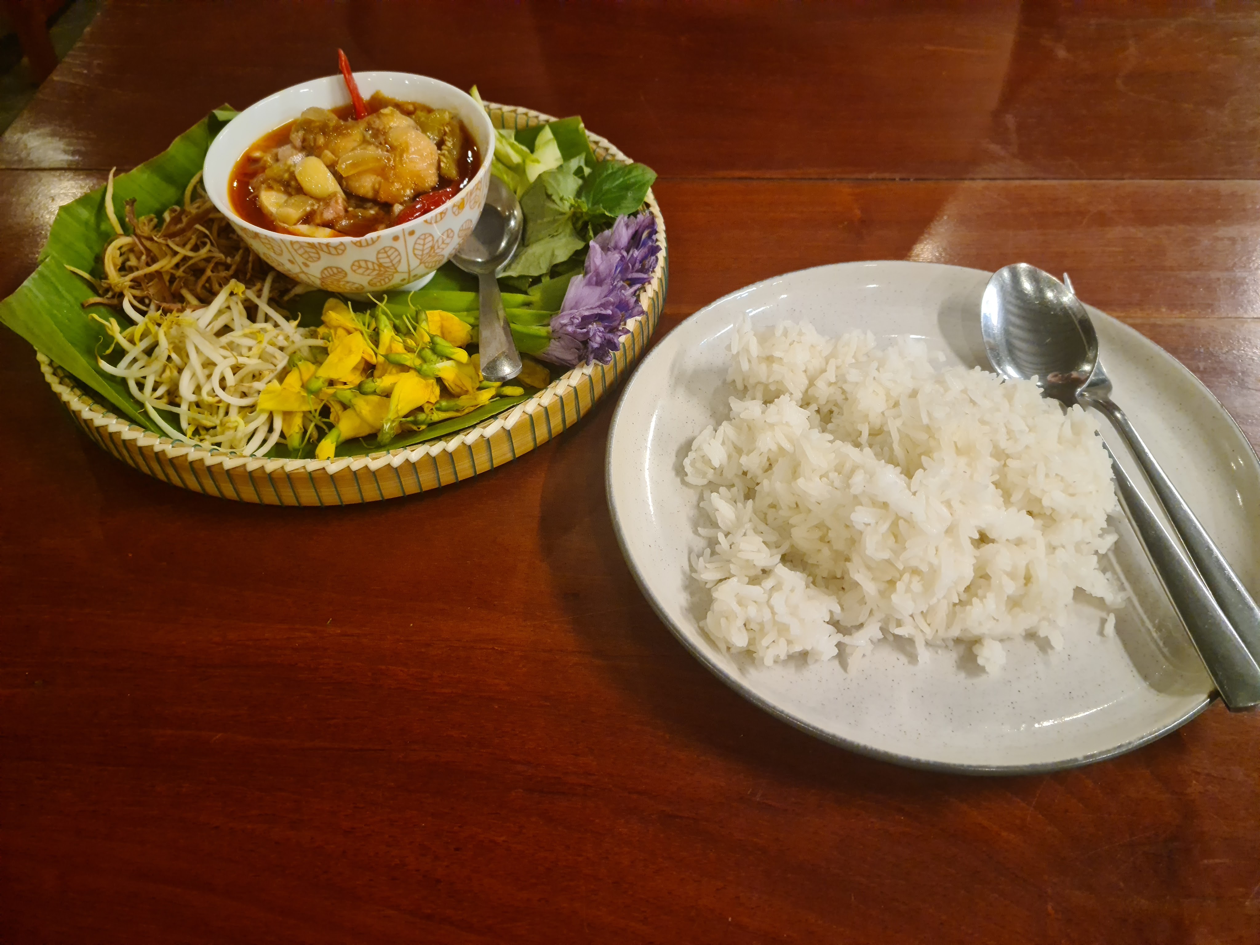 Amok – A signature Cambodian dish made with fish (or chicken/tofu) steamed in a banana leaf cup, mixed with a rich, creamy curry of coconut milk, kroeung (Cambodian spice paste), and egg, giving it a custard-like texture. And more vegetation than I knew what to do with.