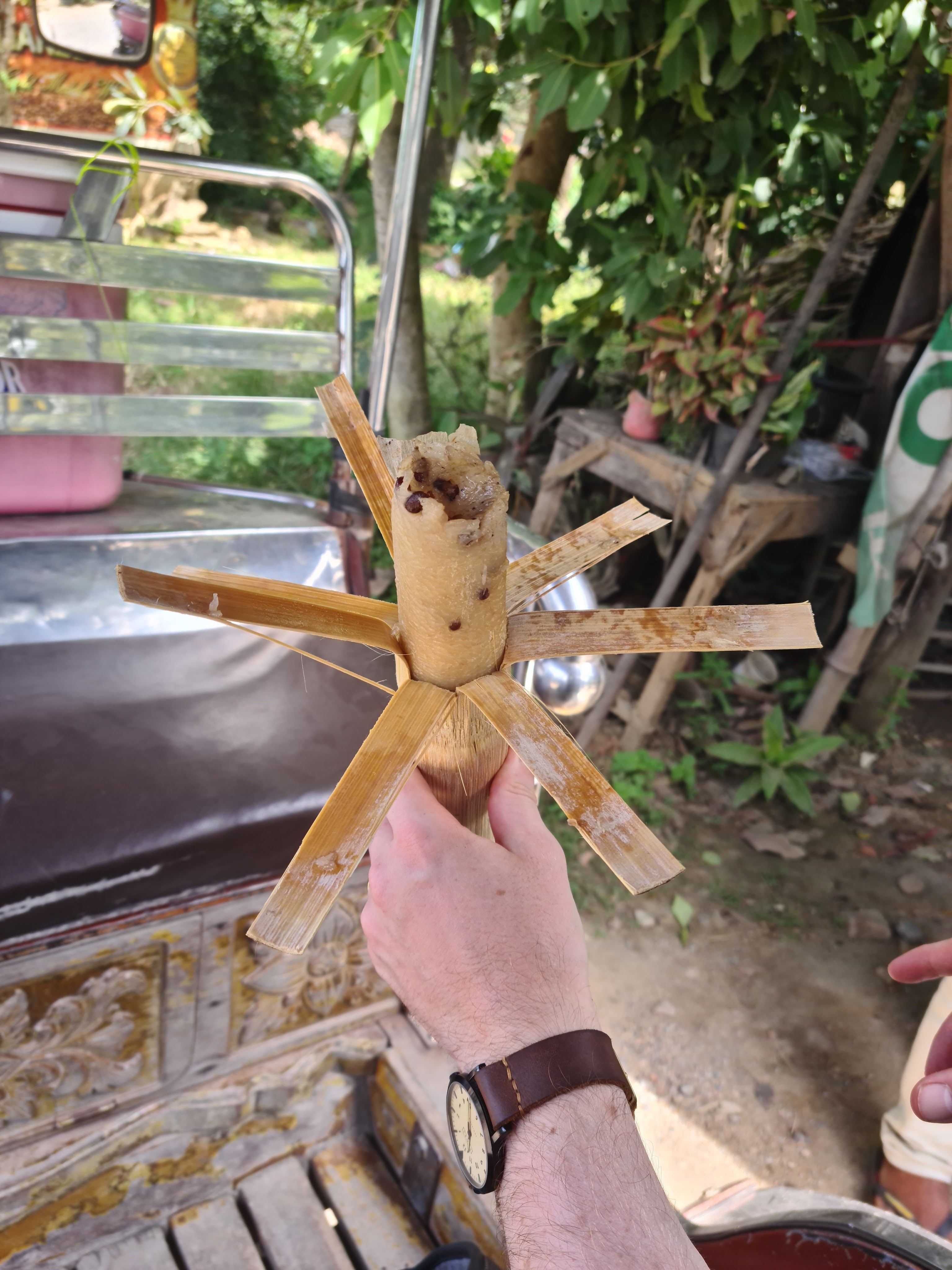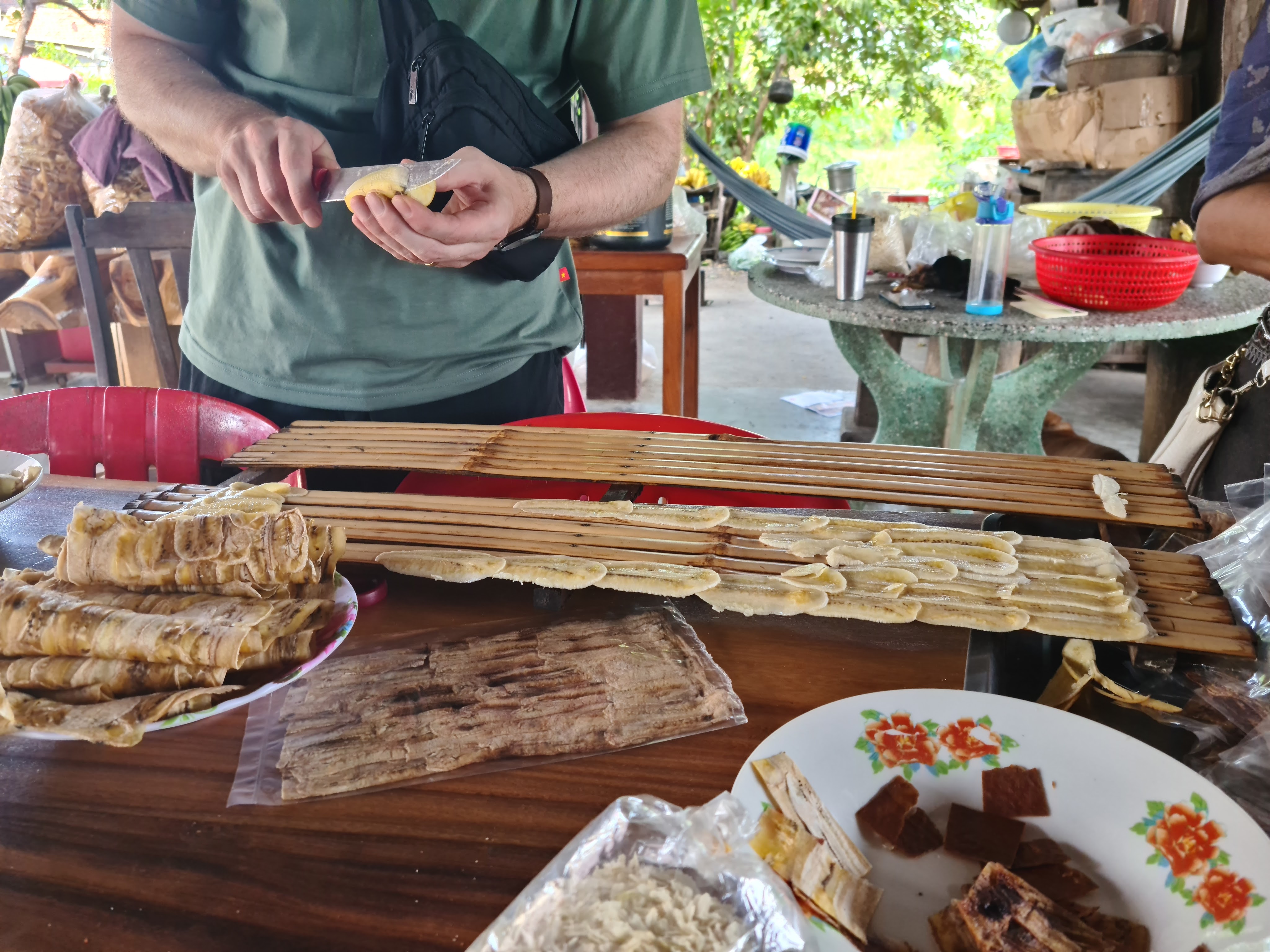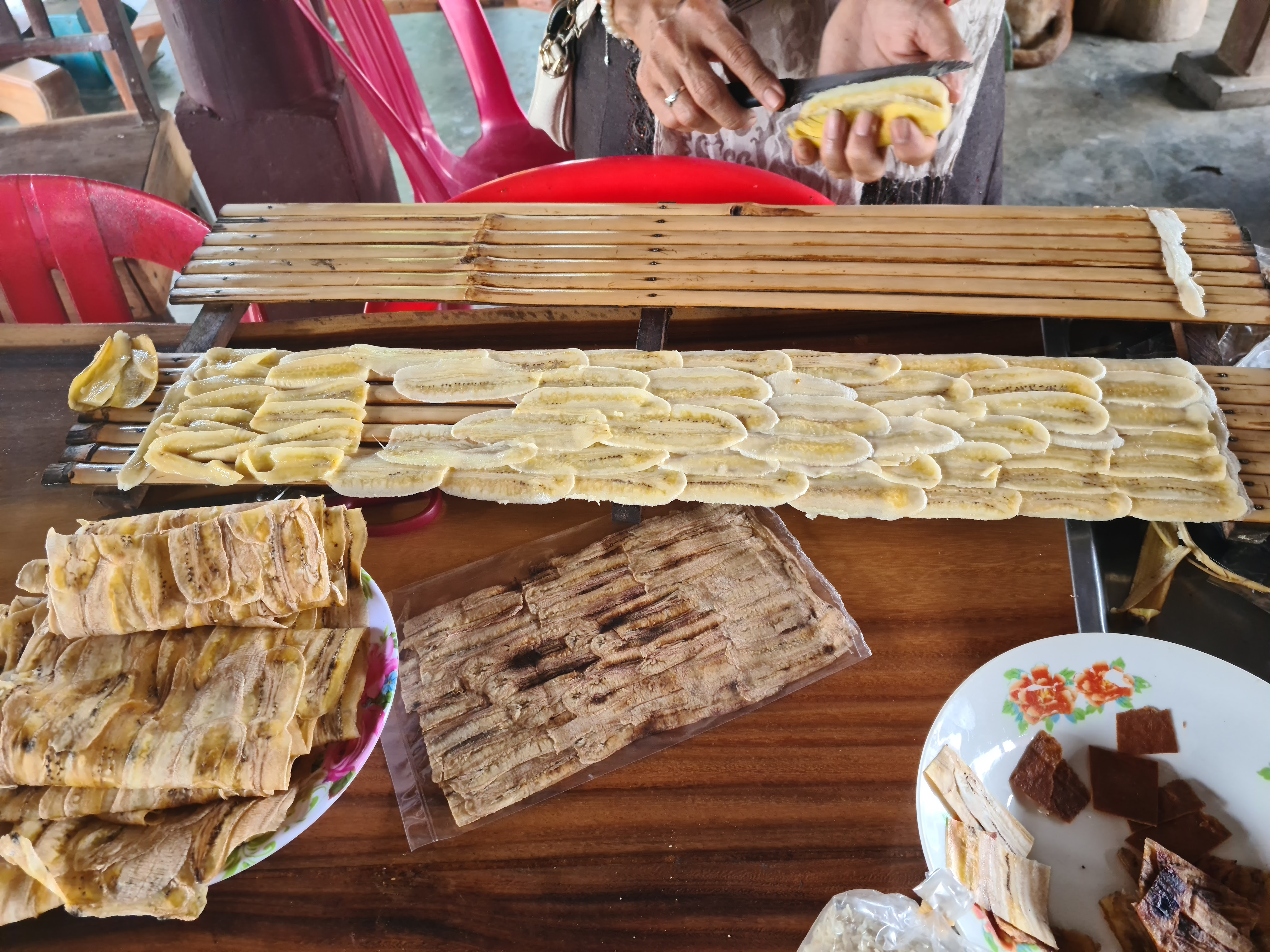 And here are the banana crisps, which Ricki got hands on with making. He has a little training before he can be as fast and precise as the lady demonstrating, but she was still very impressed with him.
