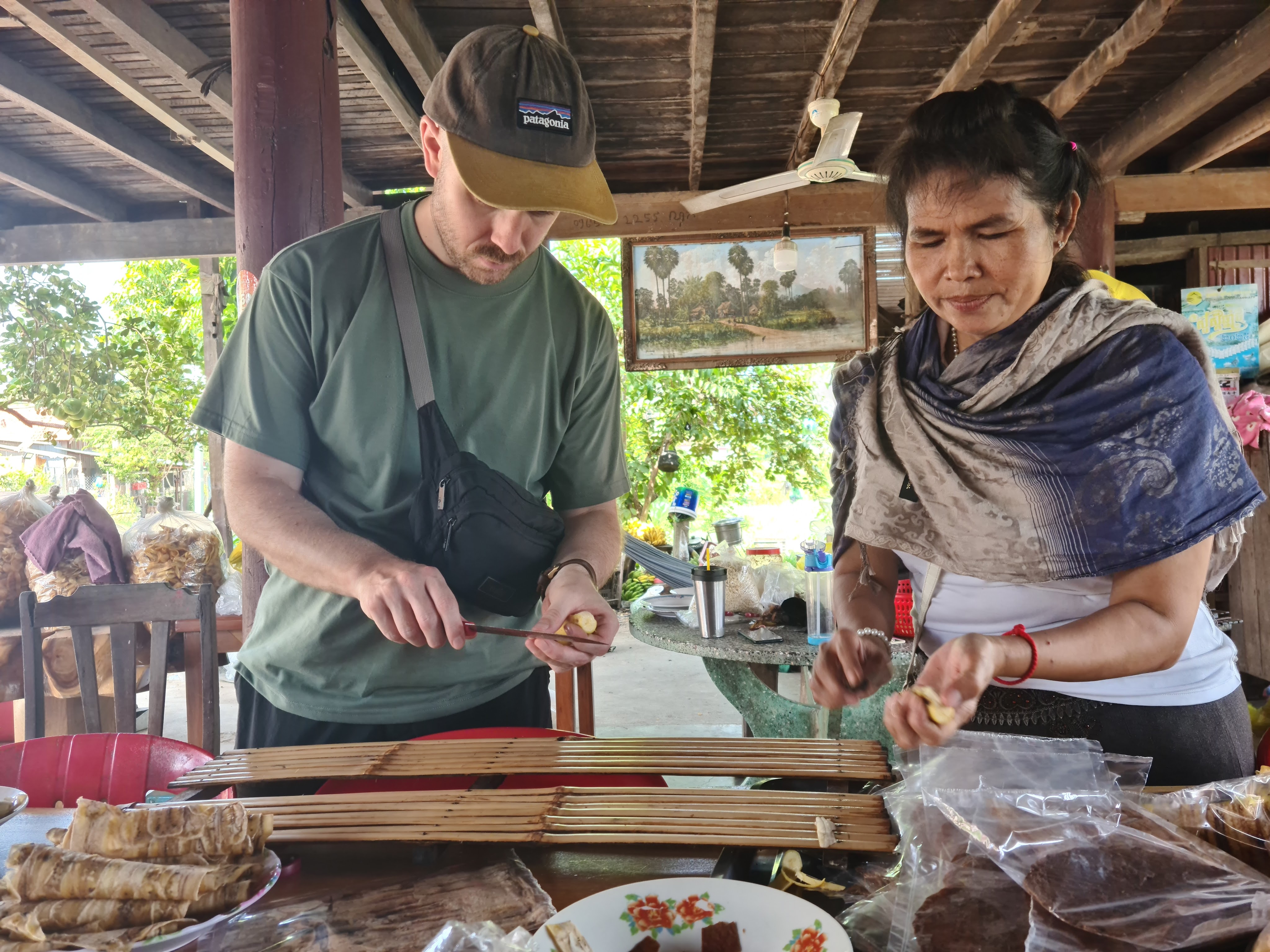 The next day we swapped Dara’s tuk tuk for our own two wheels and were guided on a cycle tour of the countryside. More extensive than our previous cycles, we were definitely grateful for the multiple snack and drink breaks in the heat of the ever-rising sun. An unanticipated stop came in the form of our guide braking suddenly as a venomous snake darted out of the undergrowth in hot pursuit of a toad. Can’t say I blame him, we tried frog legs in Phnom Penh, and they are pretty tasty!